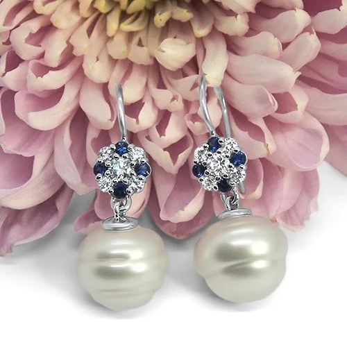 south sea cultured pearl, ceylon sapphire and diamond cluster earrings
